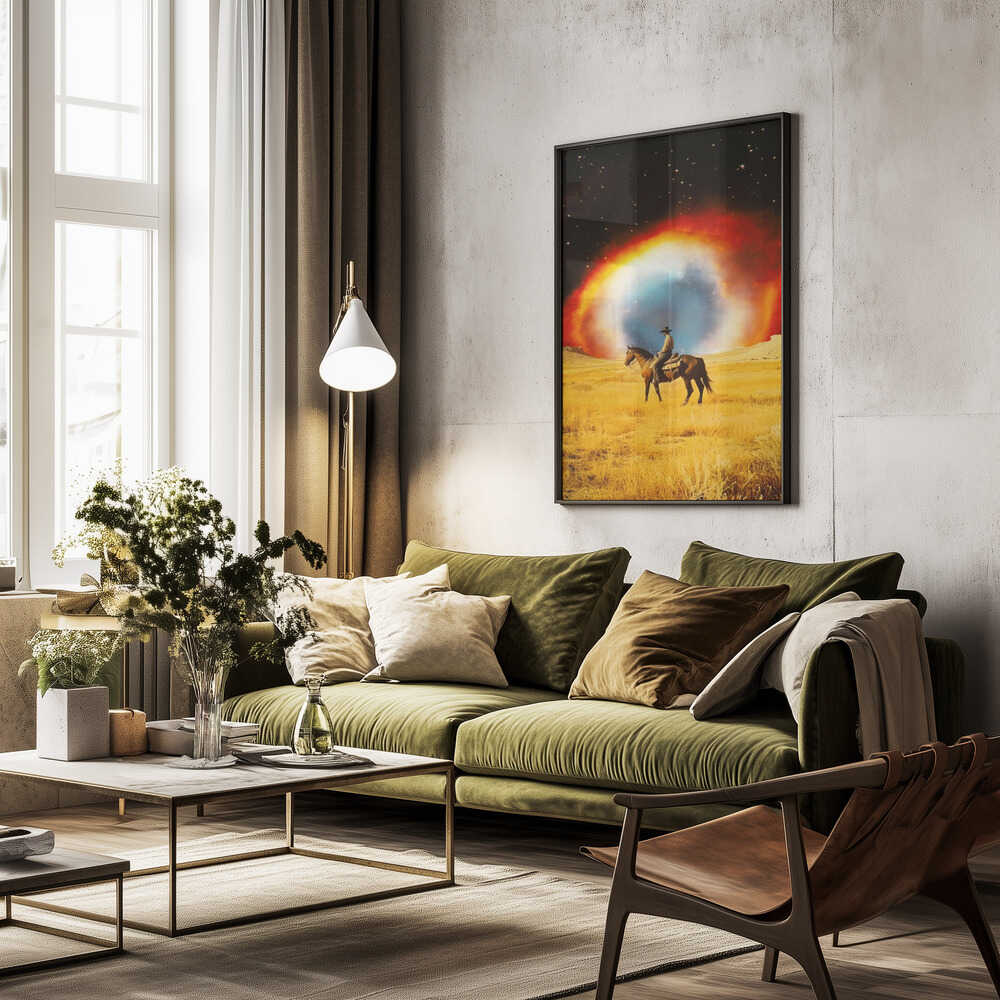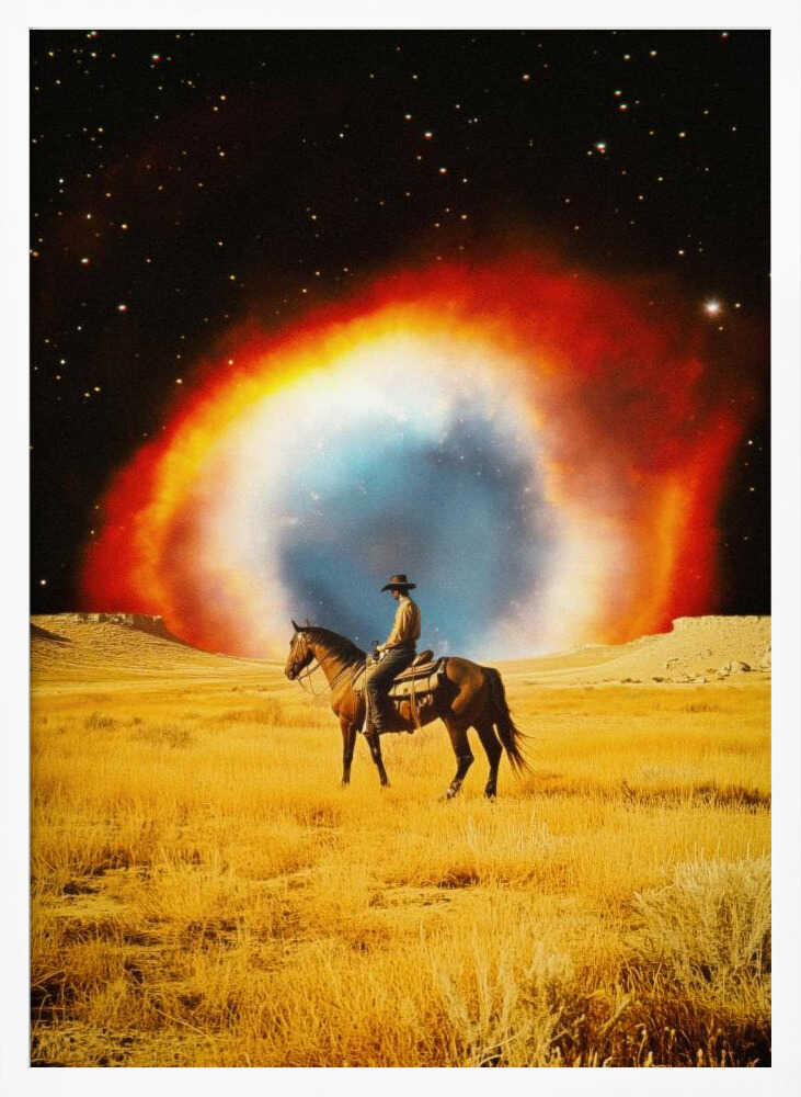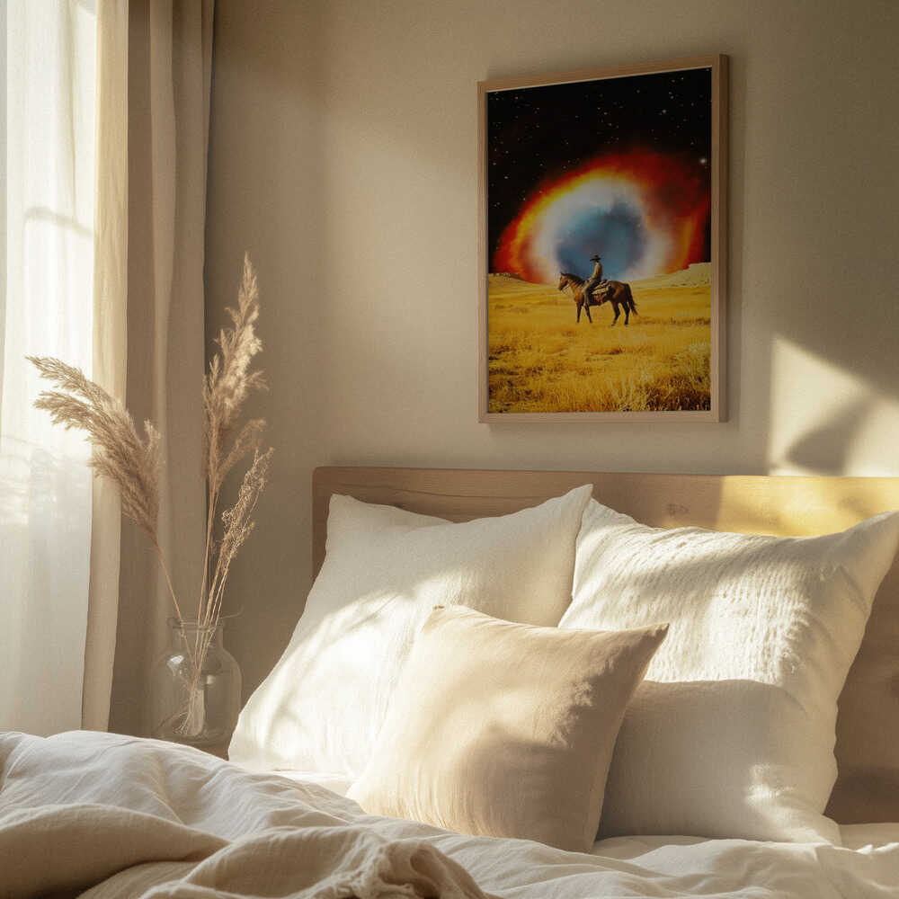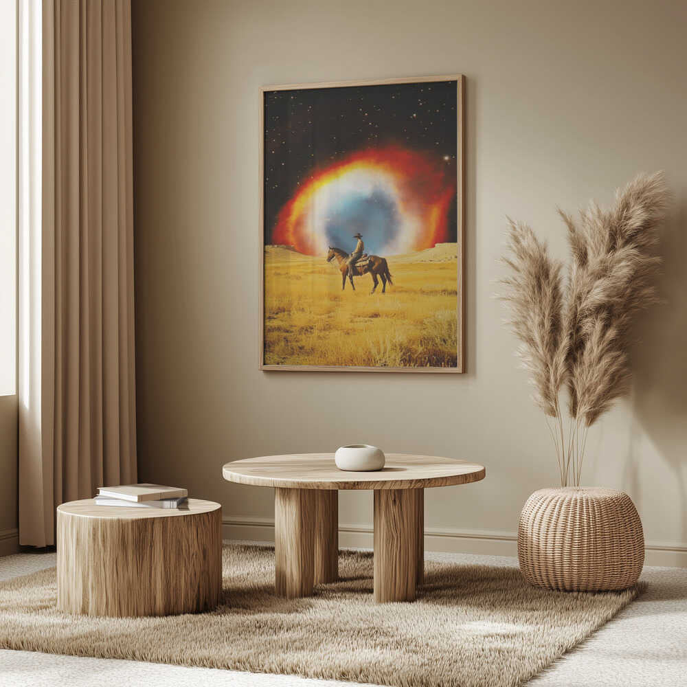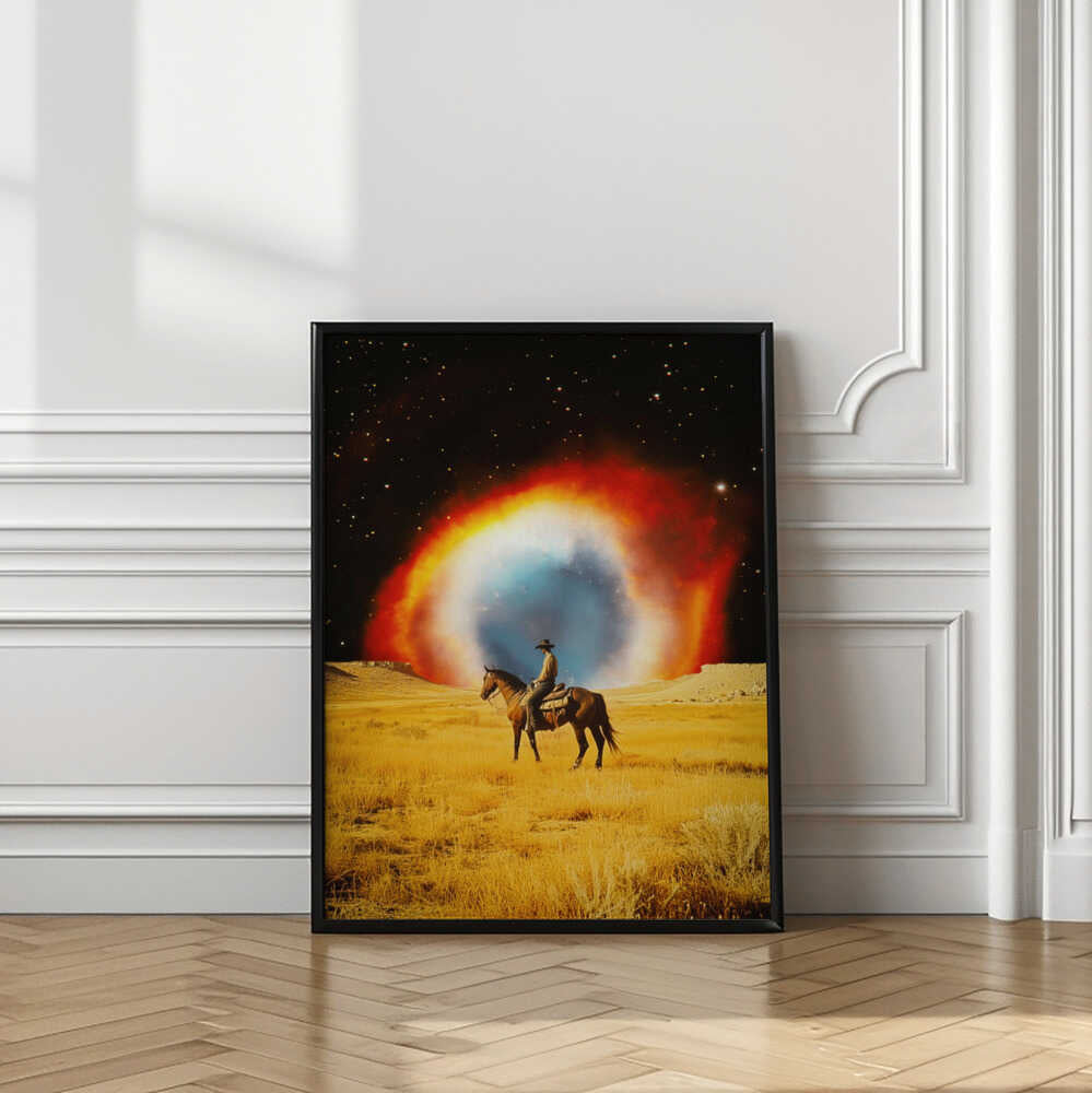 Tabloul înramat „Nebula Cowboy”, creat de Taudalpoi, este disponibil în mai multe dimensiuni, cu ramă neagră, albă sau din lemn natur. Se potrivește perfect în orice încăpere.