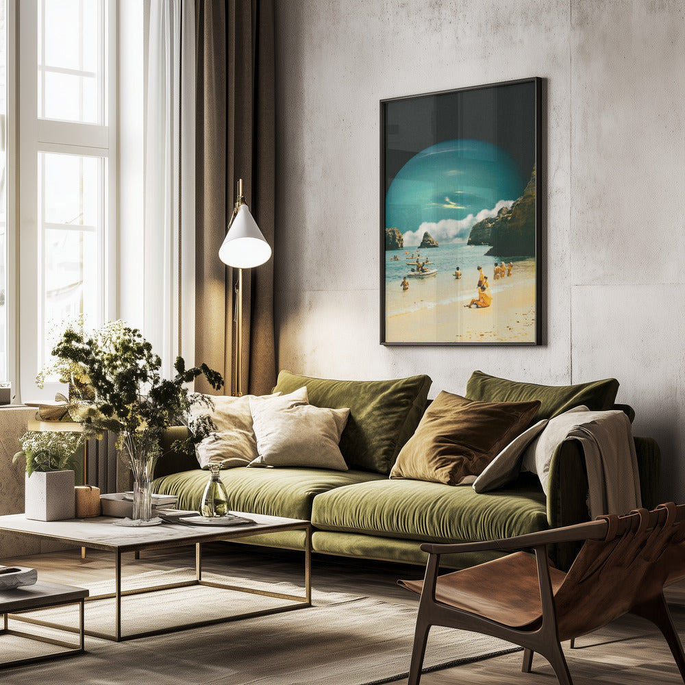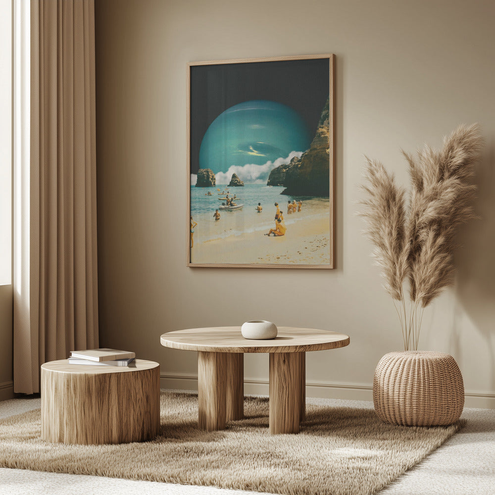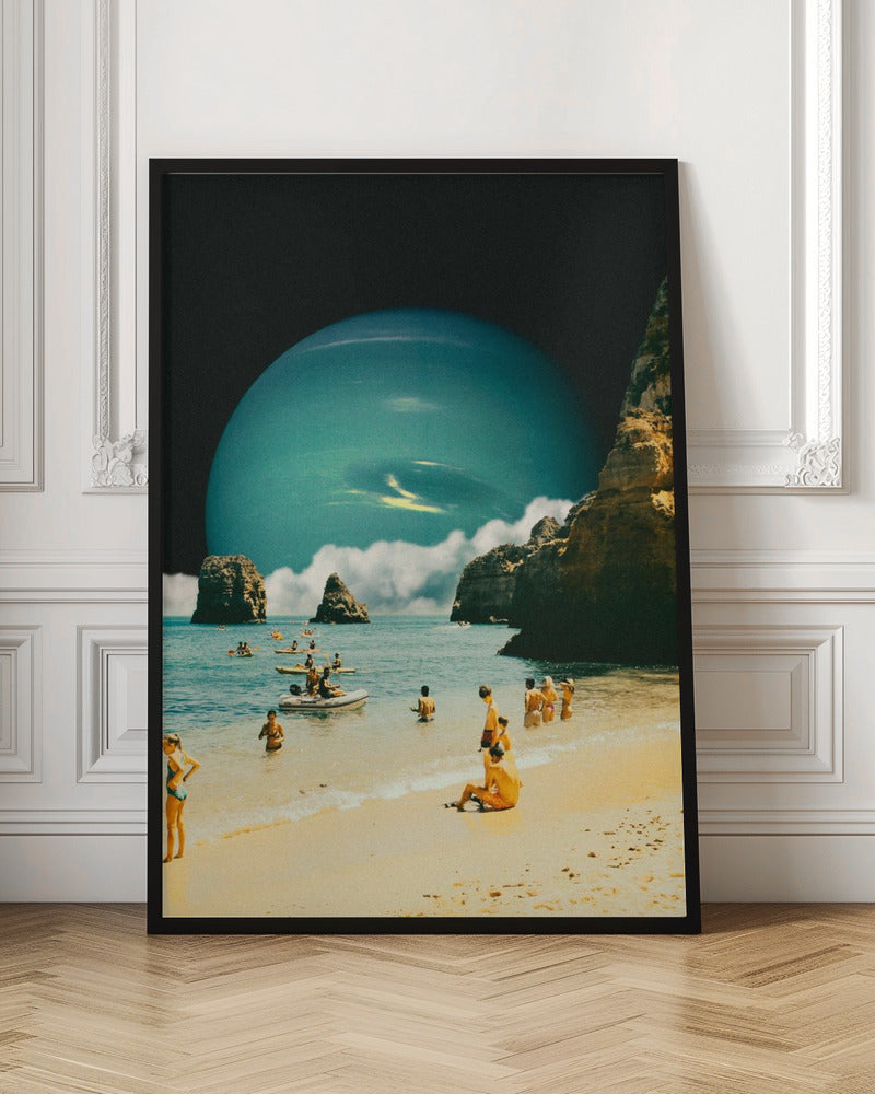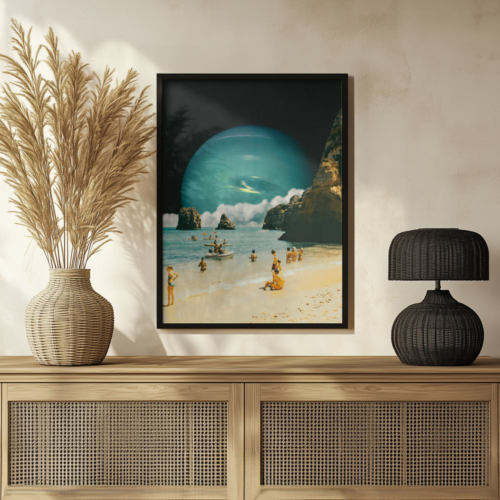 Tabloul înramat „Space Beach”, creat de Taudalpoi, este disponibil în mai multe dimensiuni, cu ramă neagră, albă sau din lemn natur. Se potrivește perfect în orice încăpere.
