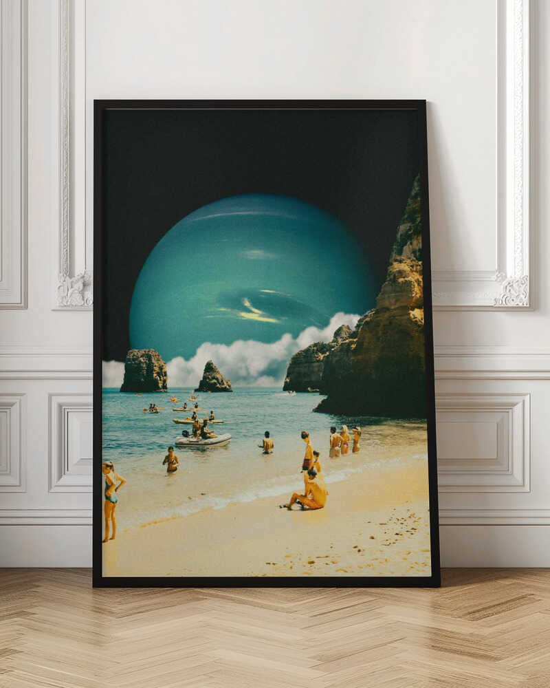Tabloul înramat „Space Beach”, creat de Taudalpoi, este disponibil în mai multe dimensiuni, cu ramă neagră, albă sau din lemn natur. Se potrivește perfect în orice încăpere.