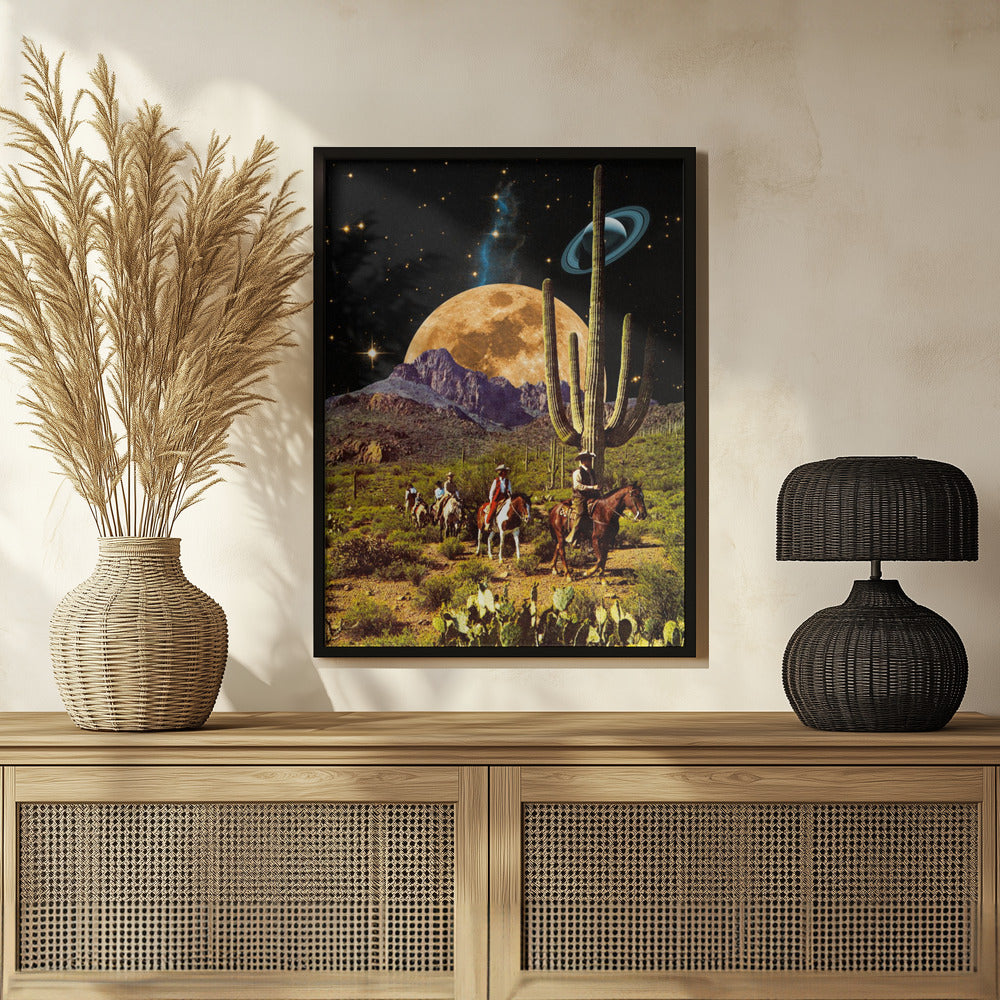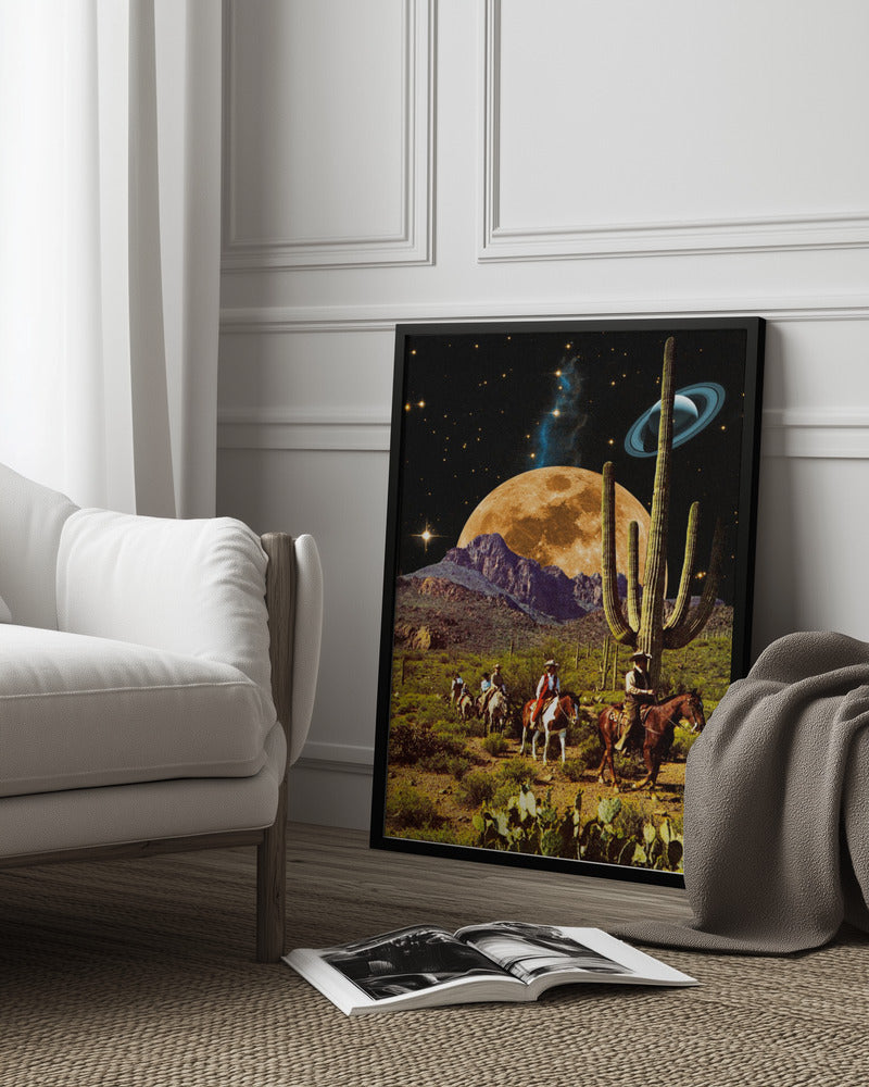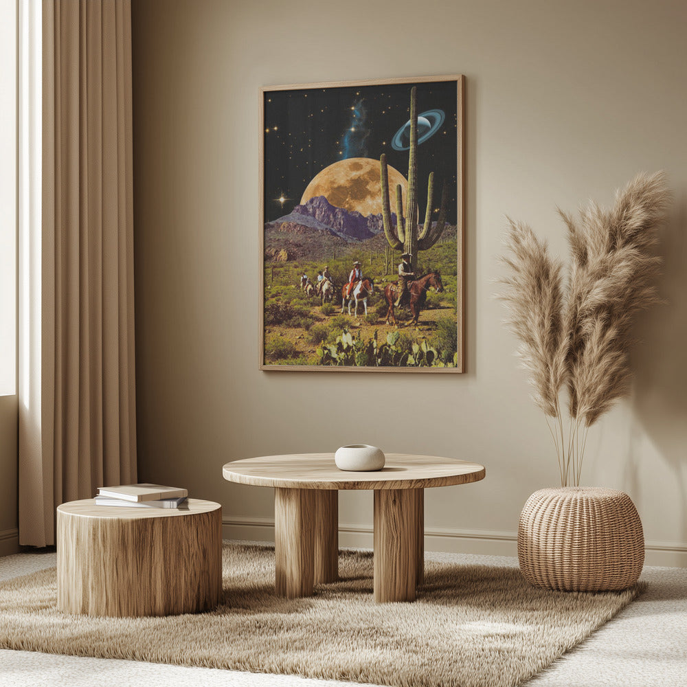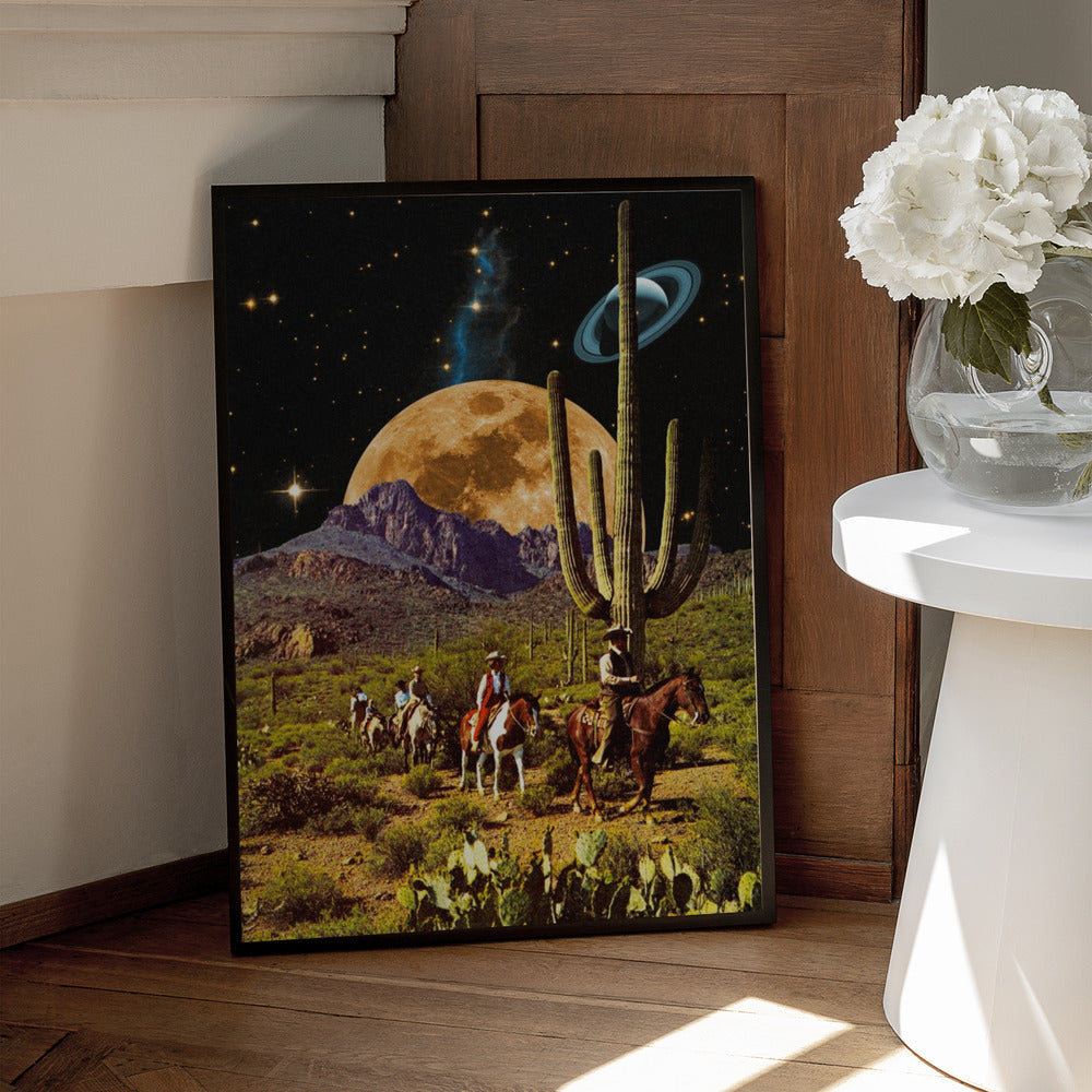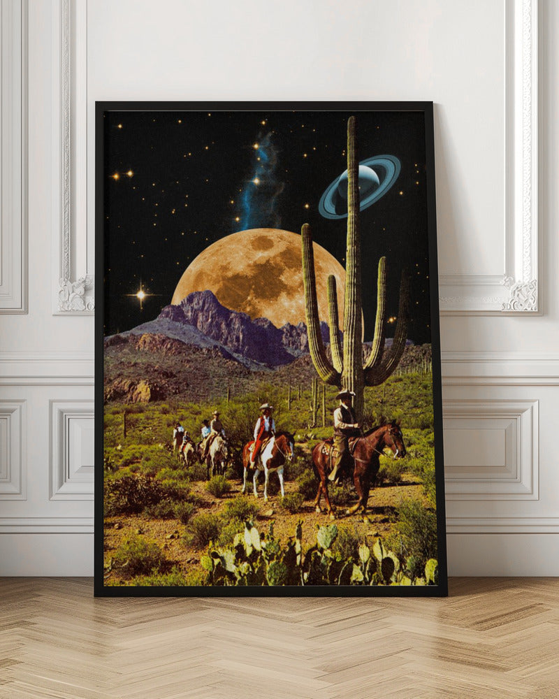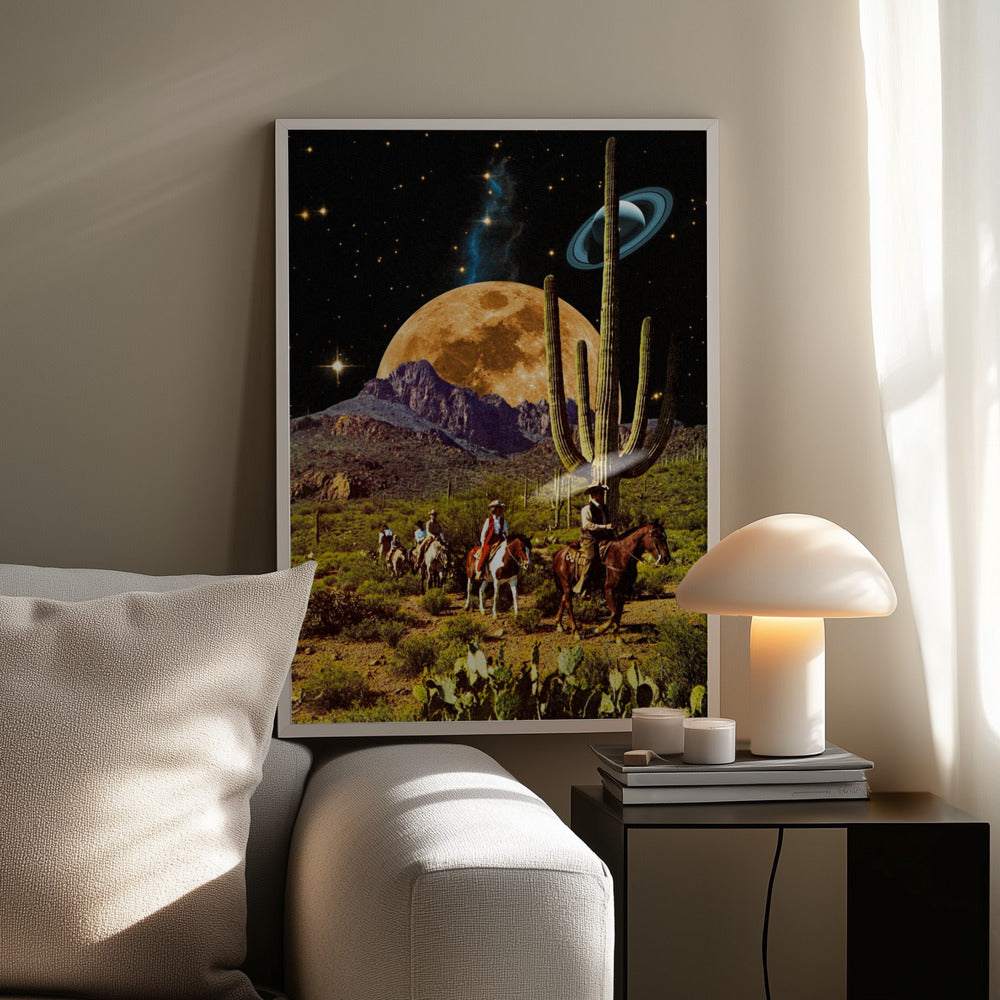 Tabloul înramat „Space Cowboys”, creat de Taudalpoi, este disponibil în mai multe dimensiuni, cu ramă neagră, albă sau din lemn natur. Se potrivește perfect în orice încăpere.