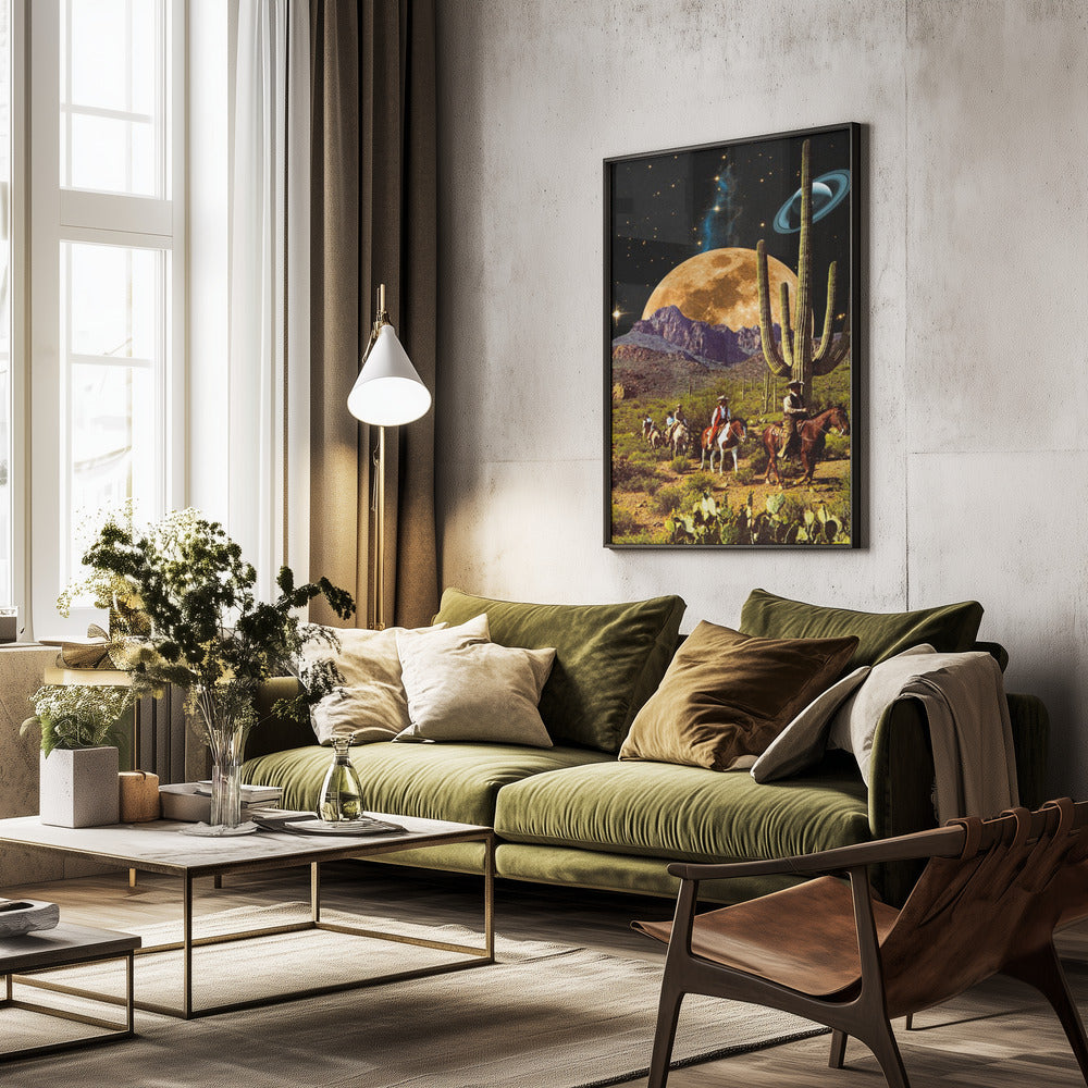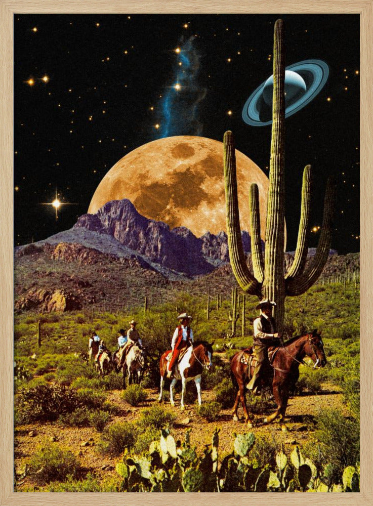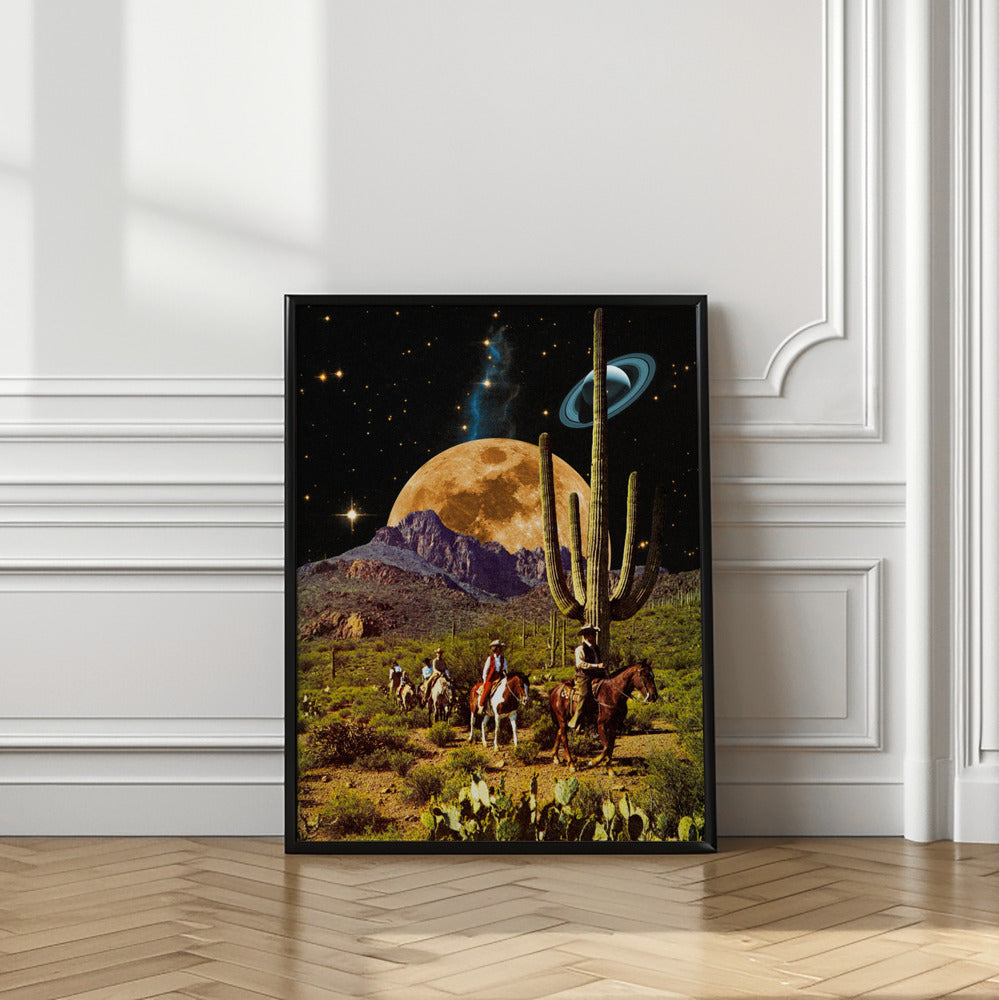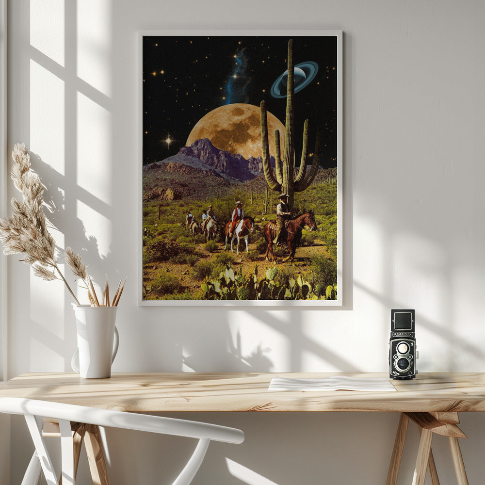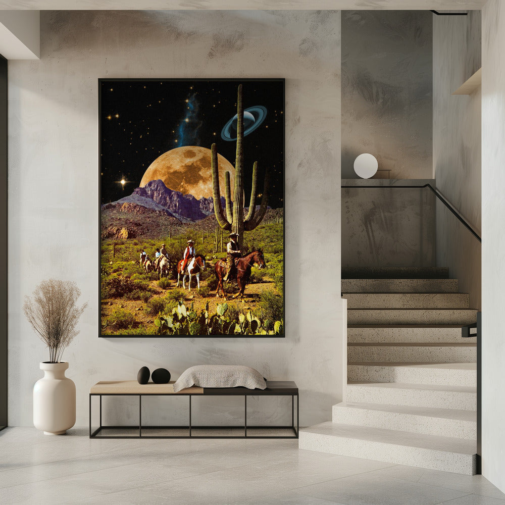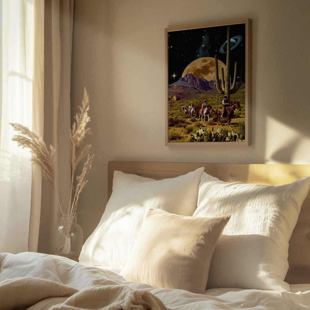 Tabloul înramat „Space Cowboys”, creat de Taudalpoi, este disponibil în mai multe dimensiuni, cu ramă neagră, albă sau din lemn natur. Se potrivește perfect în orice încăpere.