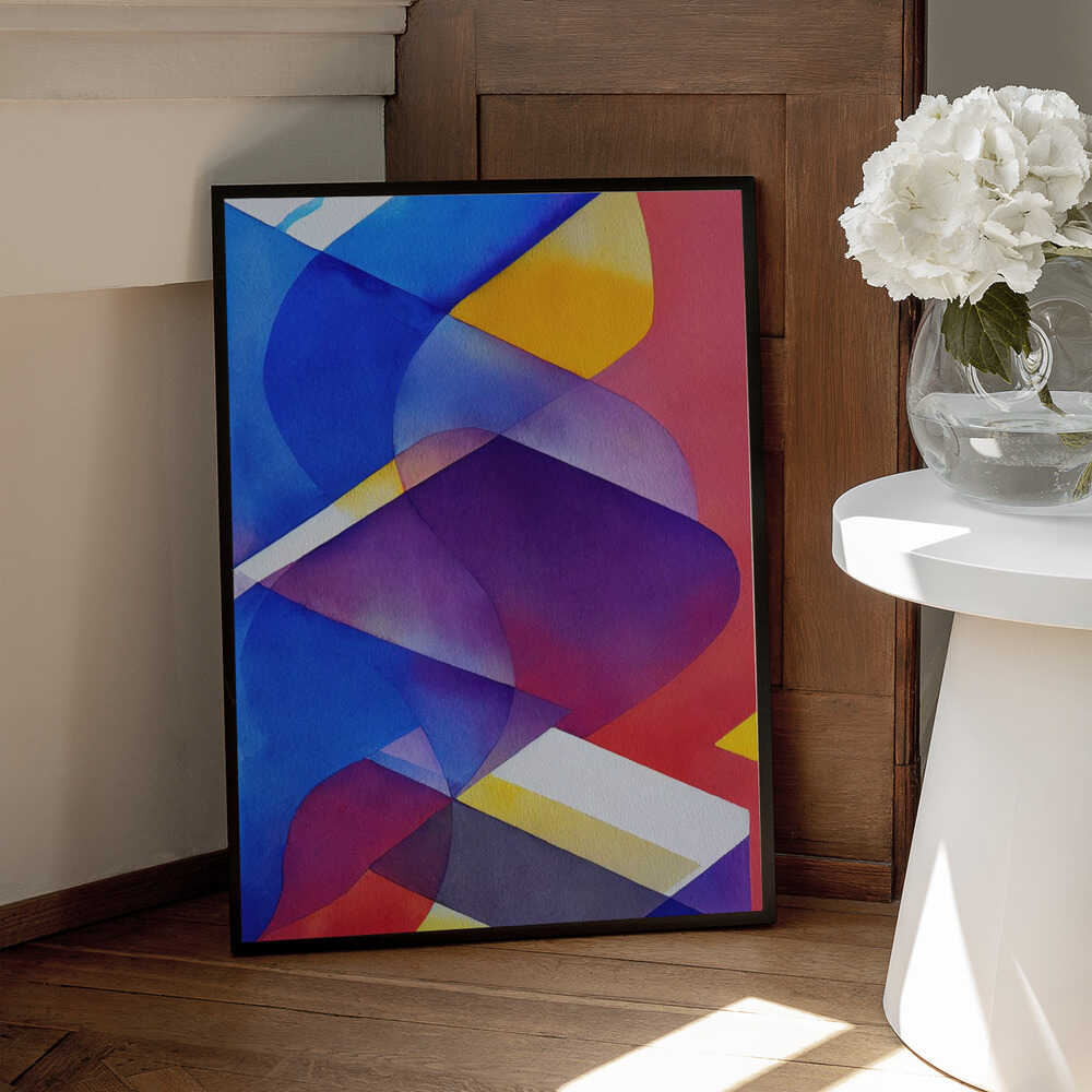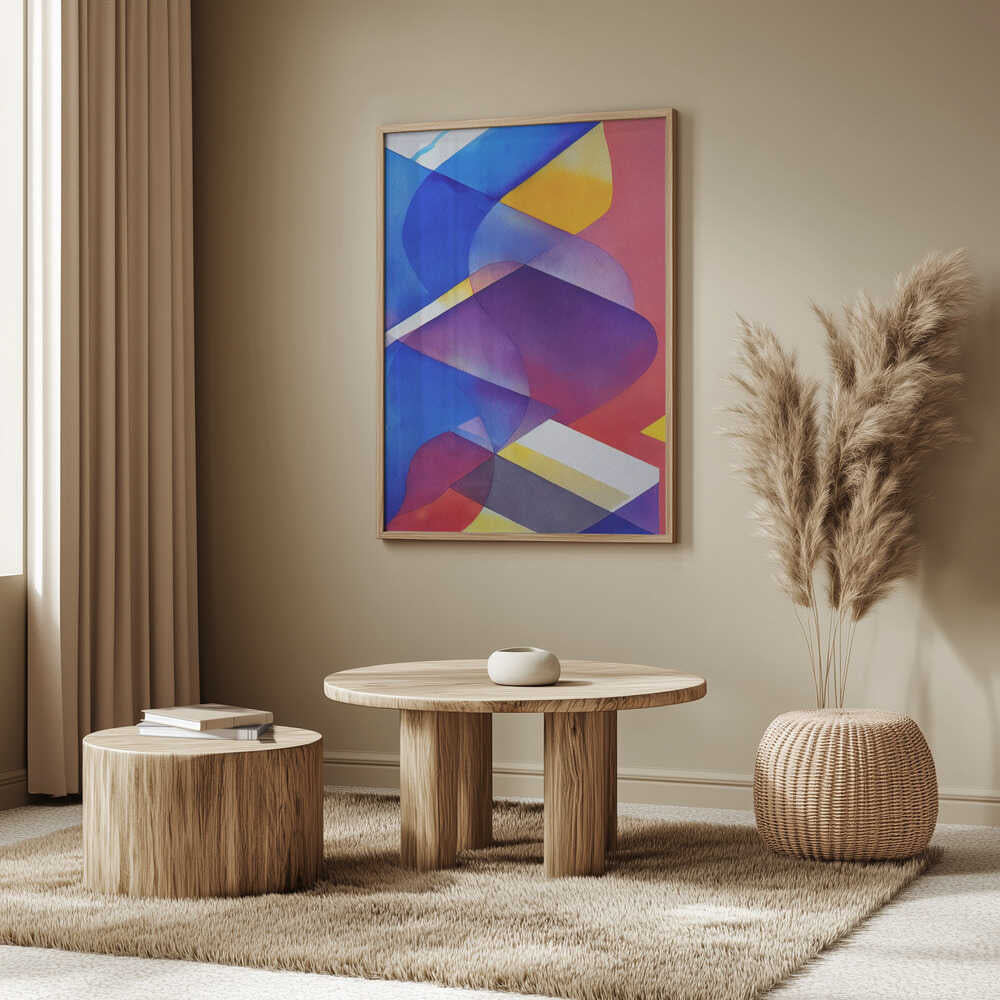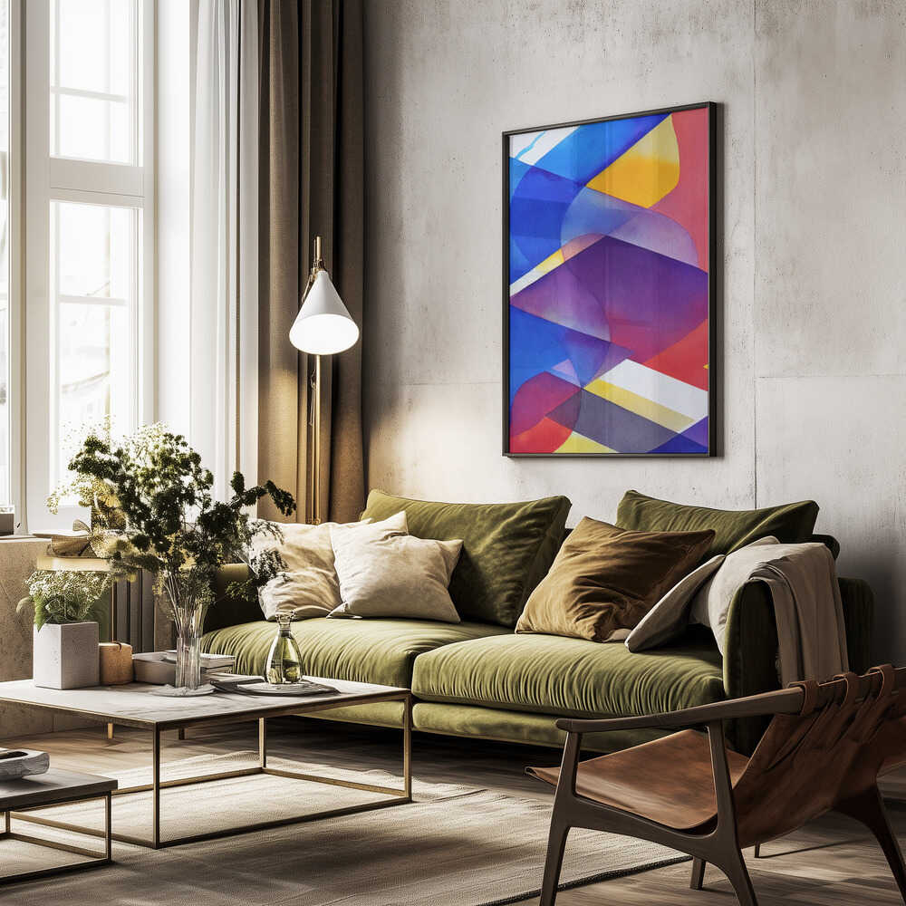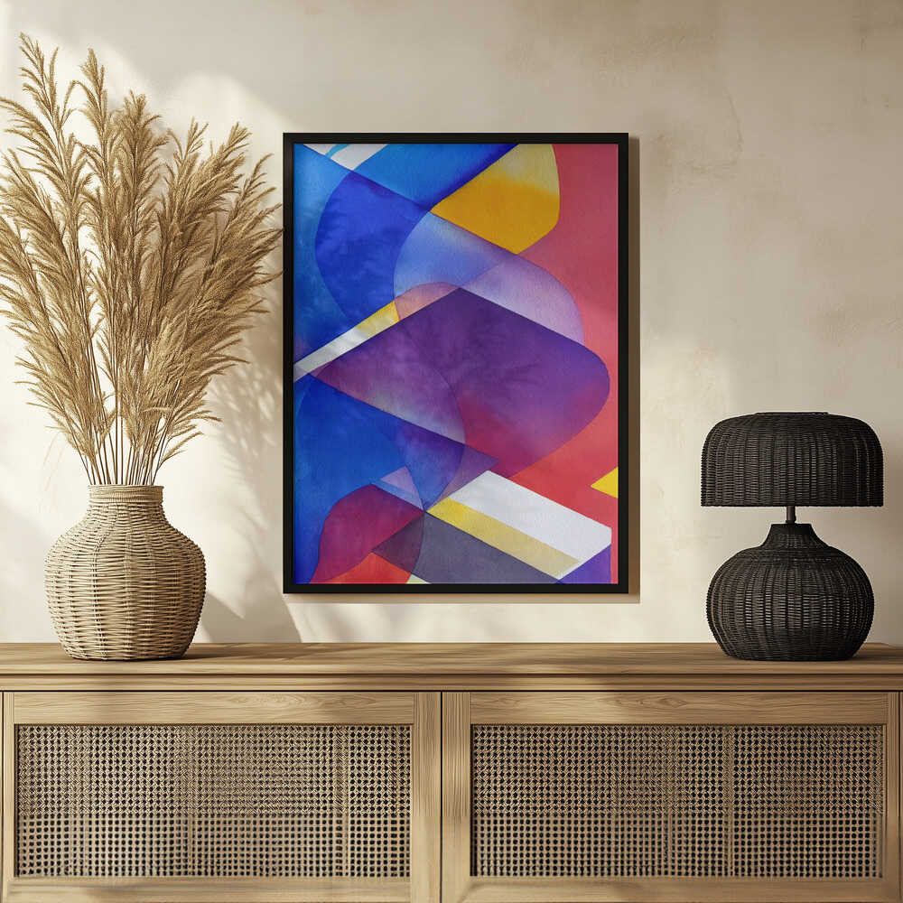 Tabloul înramat „Vibrant Overlap”, creat de Mauro, este disponibil în mai multe dimensiuni, cu ramă neagră, albă sau din lemn natur. Se potrivește perfect în orice încăpere.